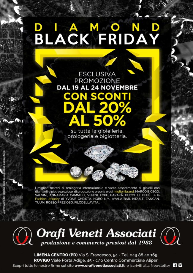 In occasione del Black Friday, dal 19 al 24 novembre, sconti dal 20% al 50% su tutta la gioielleria, orologeria e bigiotteria.